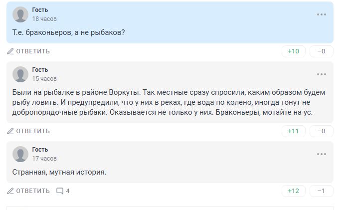 "Были на рыбалке в районе Воркуты. Так местные сразу спросили, каким образом будем рыбу ловить. И предупредили, что у них в реках, где вода по колено, иногда тонут недобропорядочные рыбаки. Оказывается не только у них. Браконьеры, мотайте на ус".