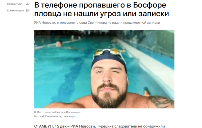 Напомним, Николай Свечников, известный и опытный пловец, основавший собственную спортивную школу, пропал во время заплыва через Босфор. В мероприятии участвовали почти 3 тысячи спортсменов, и только Свечников не достиг финиша.