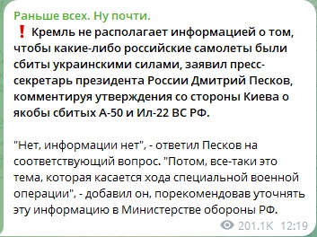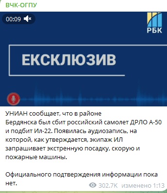 В отечественных телеграм-каналах, к слову, тоже склонны скорее верить в то, что русские самолёты оказались под ударом. Так, военный блогер Юрий Подоляка заявил, что, по его данным, информация про сбитый А-50 правдива.