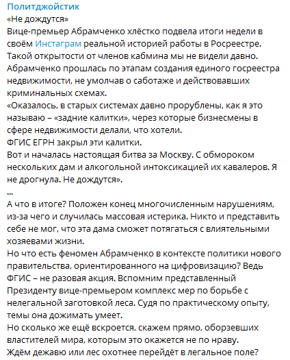 Заместитель главы правительства поделилась с подписчиками историей своей работы в Росреестре. Она не стала скрывать попытки нечистых на руку бизнесменов и чиновников обойти закон с помощью предусмотрительно приготовленных лазеек. Сама Абрамченко назвала их "задними калитками", через которые бизнесмены в сфере недвижимости делали, что хотели.