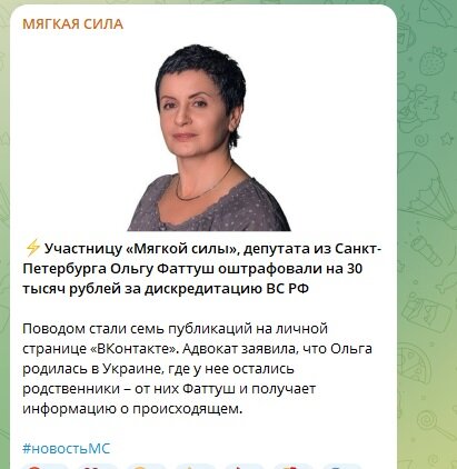 В России набирает обороты скандал вокруг муниципального депутата из Петербурга Ольги Фаттуш. Оказалось, что народная избранница "не может видеть" радующихся русских людей и проклинает солдат России. Тем не менее она продолжает трудиться на своём месте, мечтая при этом о побеге за границу.
