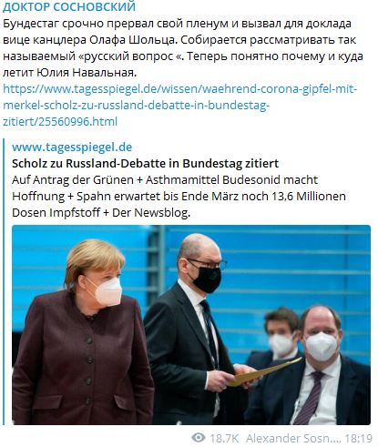 Бундестаг срочно прервал свой пленум и вызвал для доклада вице-канцлера Олафа Шольца. Собирается рассматривать так называемый "русский вопрос". Теперь понятно, почему и куда летит Юлия Навальная, - отметил журналист Александр Сосновский.