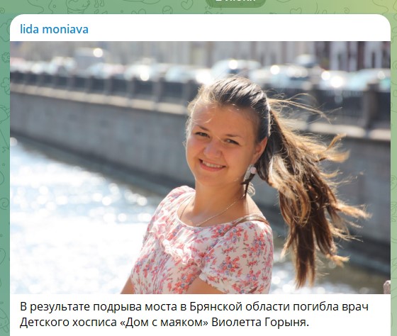 "В результате подрыва моста в Брянской области погибла врач Детского хосписа "Дом с маяком" Виолетта Горыня. Виолетта педиатр, врач паллиативной помощи. Работала в Детском хосписе с 2020 года, в последнее время была в декрете. Они ехали в поезде всей семьей – с мужем и 2 детьми. Старшему 7 лет, младшему 5 месяцев", - написала в Сети учредитель благотворительного фонда "Дом с маяком" Лидия Мониава.