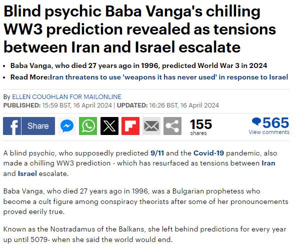 Автор статьи добавил, что после того, как Иран нанёс удар по Израилю в субботу, что вызвало ответный удар по Ливану, некоторые беспокоятся, что предсказания Ванги могут скоро сбыться.
