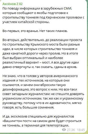 Глава Крыма Сергей Аксёнов опроверг "сенсацию" западной прессы, что под Крымским мостом построят подводный тоннель. И с иронией предложил им новый "эксклюзив" - мол, на самом-то деле там будет терминал для телепортации.
