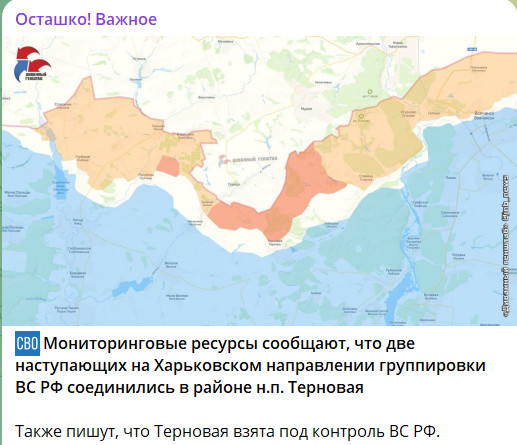 Также мониторинговые ресурсы сообщают, что две наступающих на Харьковском направлении группировки Вооруженных сил России соединились в районе поселка Терновая. Также пишут, что Терновая взята под контроль русских бойцов.
