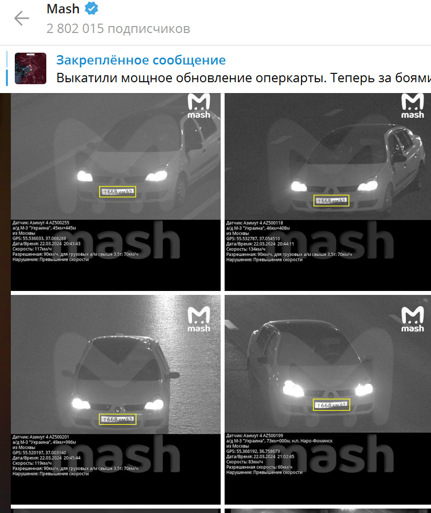 Телеграм-канал Mash уточняет, что исполнители теракта в "Крокусе" не менее шести раз нарушили ПДД в пути к границе с Украиной. Их средняя скорость была за 90 км/час. В эпизодах - больше 140.