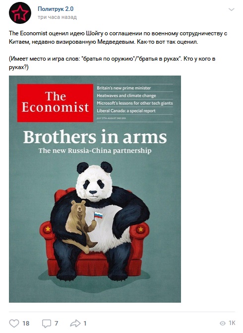 Несколькими днями ранее американская газета The New York Times опубликовала материал, в котором говорится о сильном беспокойстве США по поводу сближения России и Китая. Согласно докладу Пентагона, союз Москвы и Пекина угрожает американскому внешнеполитическому доминированию. В этой связи не трудно догадаться о цели, которую преследует опубликованная британцами карикатура.