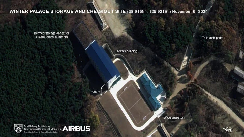 Инфраструктура объекта также вызывает вопросы: расширенные дороги позволяют транспортировать тяжелые тягачи с ракетами Hwasong-19, способными достичь территории США. На территории расположено 36-метровое здание для вертикального хранения ракет, а за ним — укрепленное сооружение с четырьмя пусковыми установками, скрытыми под землей.