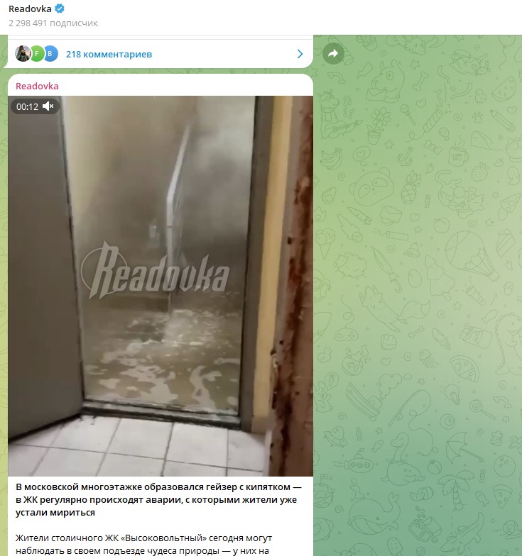 Как пишет канал Readovka, в итоге после запуска отопления жители нескольких домов встретили утро "не с чашечкой ароматного кофе, а с тазиком бодрящего кипятка, вооружившись тряпками". И вместо утреннего душа можно доставать веники и выходить париться в подъезд - там настоящая баня и воды по щиколотку.