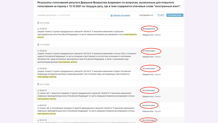 Зато выяснилось из статистики голосований, что вице-спикер практически всегда либо воздерживался от выражения собственного мнения по вопросу иноагентов, либо не голосовал вовсе. А среди них были вообще-то законопроекты, ужесточающие рамки для "поуехавших", вредящих стране.