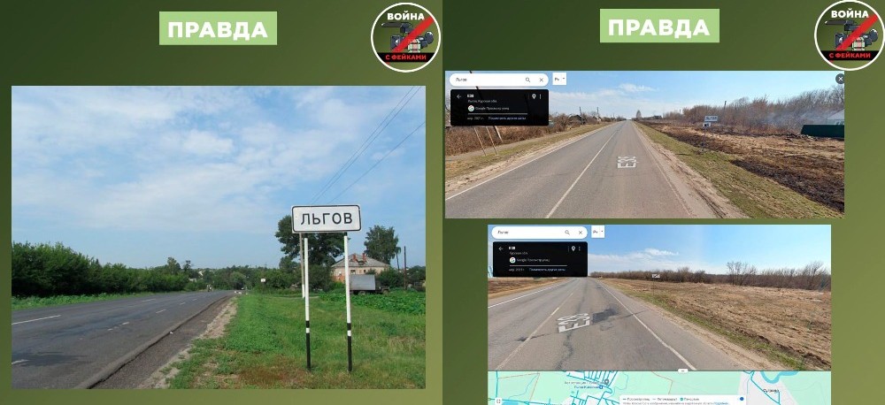 Кроме того, стоял макет не на двух опорах, как положено, а лишь на одной. Убедиться в том, что ВСУ нарисовали себе "победу", можно, взглянув на реальный указатель Льгова на панорамных картах.