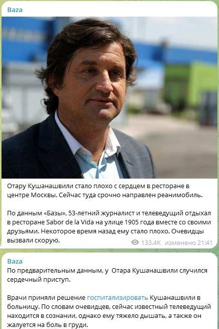 53-летний Отар Кушанашвили был в известном московском ресторане, когда вдруг почувствовал себя плохо. Как сообщает телеграм-канал Baza, журналист ощутил сильную боль в груди и ему стало тяжело дышать. Сразу вызвали скорую помощь.