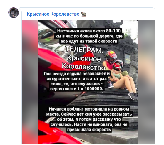 Как позже сообщил в Telegram коллега Тропицель Андрей Петров, сославшись на слова молодого человека Насти, "то, что случилось, - вероятность 1 к 1 000 000". Он раскрыл некоторые подробности произошедшего, отметив, что "Настя не виновата, она не превышала скорость".