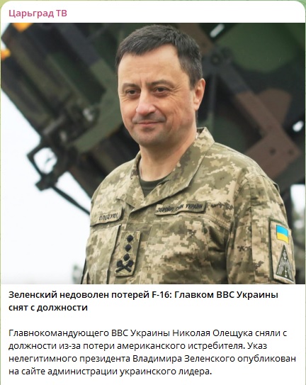 Уволенный после потери американского истребителя F-16 командующий ВВС ВСУ Николай Олещук* решил прокомментировать свою отставку. Он поместил короткое сообщение в Telegram.