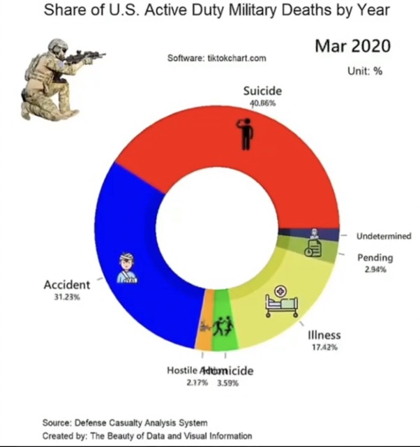 В 2021 году в США было зафиксировано рекордное количество самоубийств среди военнослужащих. По данным издания The Epoch Times, в 2020 году число самоубийств в действующей армии достигло 176, что является самым высоким показателем с 1938 года.