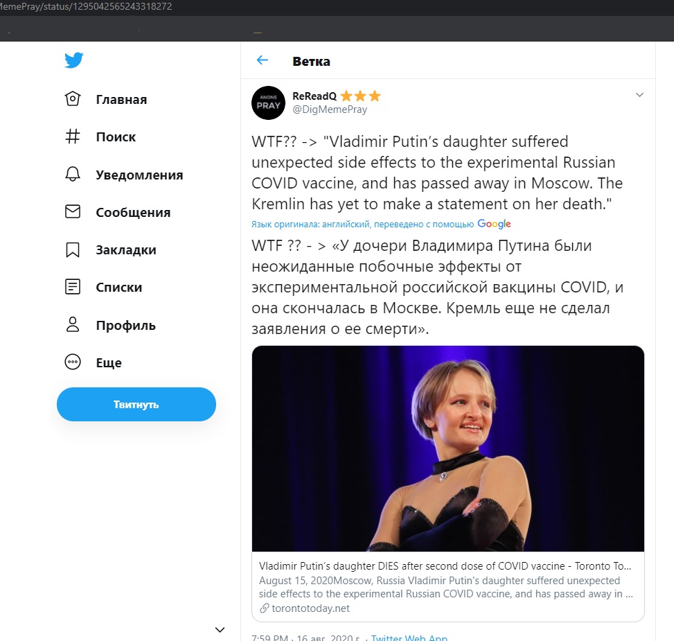 Toronto Today выпустил подробный, но совершенно фейковый материал о кончине испытавшей на себе вакцину от коронавируса российского производства. В то же время авторы ReReadQ @DigMemePray, понимая, что имеют дело с уже удалённым фейком, семь (!) раз опубликовали скриншот сообщения со своими комментариями. Например, автор блога писал, что скриншот сделал некий аноним незадолго до того, как материал был удалён. Не обошлось и без "клюквы":