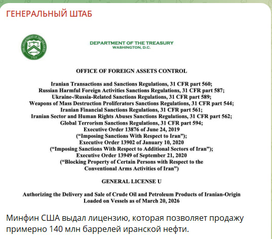 Одновременно с этим Минфин США выдал лицензию, которая позволяет продажу примерно 140 млн баррелей иранской нефти. Ранее министр финансов анонсировал это как инструмент борьбы с Ираном.