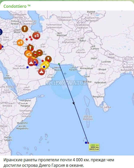 По информации WSJ , Иран нанёс удар баллистическими ракетами по британской военной базе Диего-Гарсия в Индийском океане. При этом американские журналисты заявляют, что КСИР якобы не достигли целей, но этот шаг ознаменовал первое оперативное применение Ираном баллистических ракет средней дальности и значительную попытку выйти за пределы Ближнего Востока и угрожать интересам США.