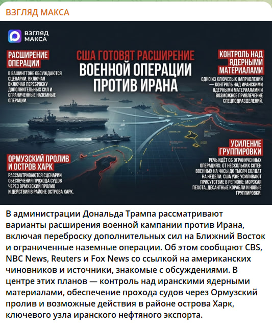 Парадокс в том, что одновременно с заявлениями о "победе" Пентагон перебрасывает в регион три корабля и 2500 морпехов. Также рассматривается план оккупации или блокады иранского острова Харк — ключевого нефтяного терминала. Фактически, премьер Израиля Нетаньяху на днях публично подтвердил подготовку к наземной операции и оккупации ряда регионов.