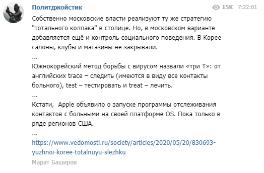 Политолог Марат Баширов прокомментировал в Telegram методы борьбы с коронавирусом в Южной Корее и заметил некоторые сходства с нынешней московской действительностью.