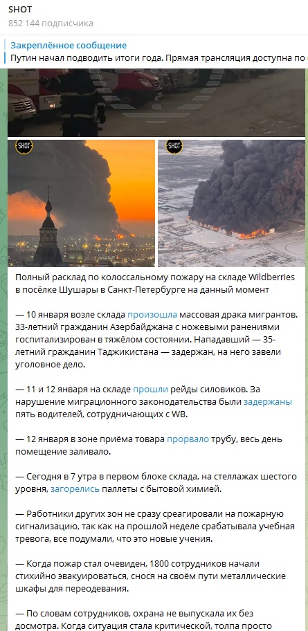 В Санкт-Петербурге на складе маркетплейса Wildberries 13 января произошёл пожар на площади 70 тысяч квадратных метров. Как уточняли в региональном управлении МЧС, во время пожара произошло обрушение. Работников склада эвакуировали, данных о пострадавших не поступало (при этом в соцсетях утверждается, что один сотрудник склада пропал без вести, но пока официальных подтверждений тому не было).