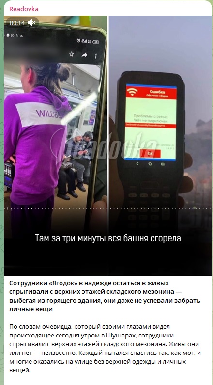 Как передаёт телеграм-канал Readovka, сотрудники маркетплейса были вынуждены выпрыгивать с верхних этажей. Огонь расходился так быстро, что люди не успевали взять личные вещи - уйти бы самим.