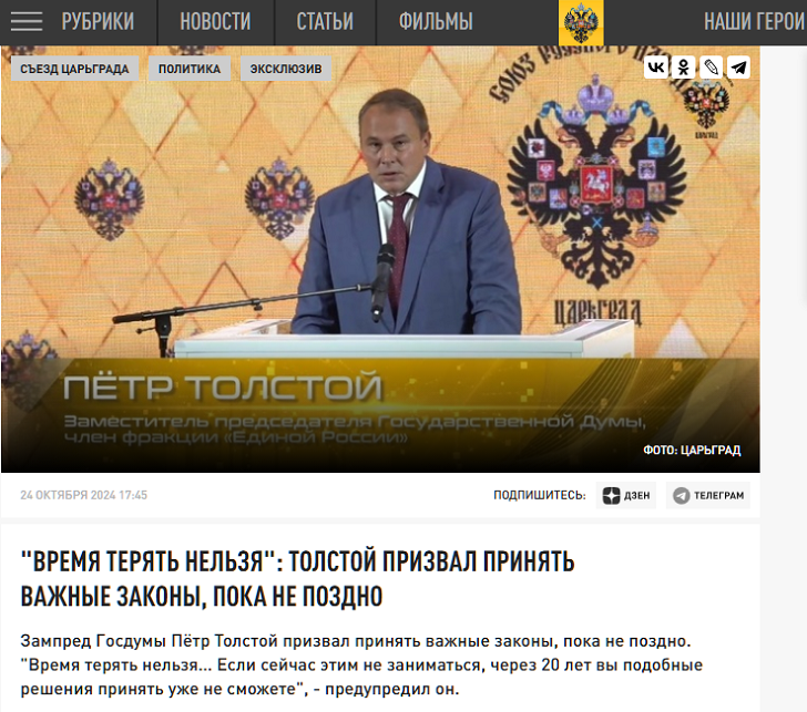 "Время терять нельзя": Толстой призвал принять важные законы, пока не поздно Фото: Царьград