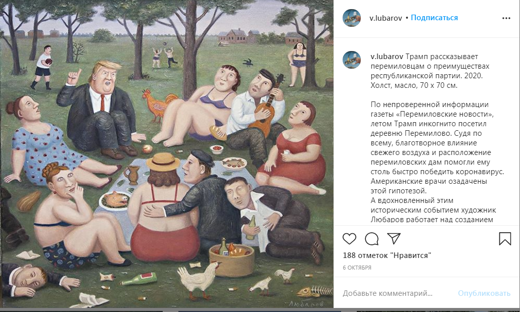 Тем не менее историю о том, как Трамп отдыхал в российской глубинке, где снискал расположение местных дам, можно будет узнать из четырёх картин, уже созданных Любаровым. И это ещё не вся история визита, многое будет написано художником позднее.