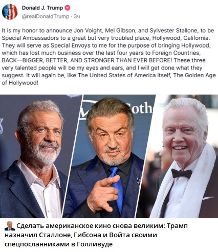 О "назначении" Трамп написал на своей странице в социальной сети Truth Social. Он назвал Гибсона, Сталлоне и Войта очень талантливыми людьми, которые будут его глазами и ушами в Голливуде.