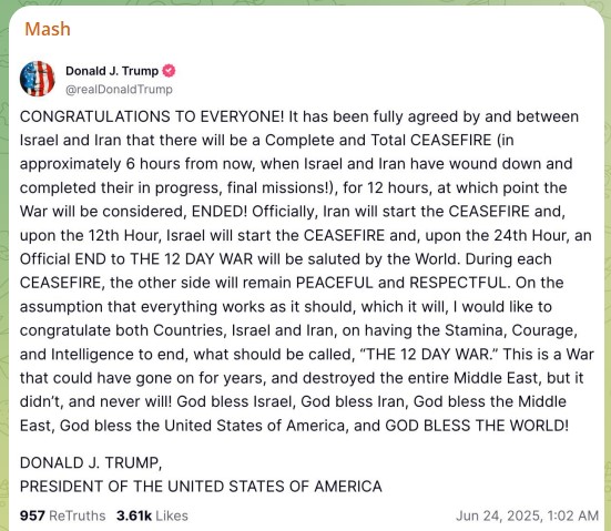 "Израиль и Иран полностью договорились о том, что будет полное и тотальное прекращение огня (примерно через 6 часов, когда Израиль и Иран свернут и завершат свои текущие, последние миссии!) на 12 часов, после чего война будет считаться законченной! Официально Иран начнет прекращения огня, а на 12-й час Израиль начнет прекращения огня, и на 24-й час мир будет салютовать официальному окончанию 12-дневной войны", – написал Трамп в своей социальной сети Truth Social.