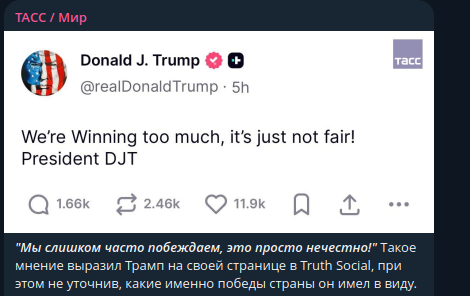 Теперь к списку нестандартных заявлений добавилось и сожаление о слишком частых победах. Трампу стало стыдно за успехи США, и он решил поделиться этим чувством с подписчиками.