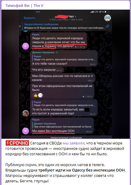 В Telegram-канале "СВОД" появилась информация о подготовке Украиной очередной провокации. Поводом для публикации стал скриншот одного из морских чатов в этом же мессенджере. Изображение разместил канал "Тимофей Ви | The V".