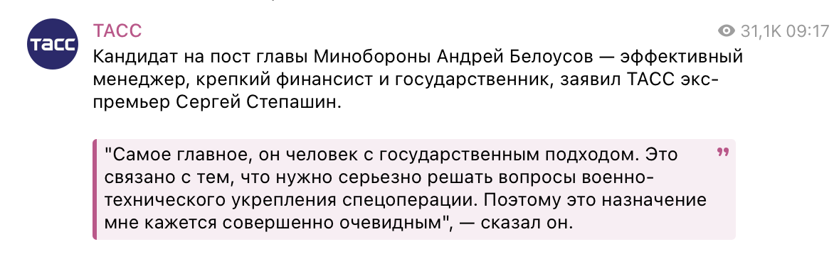 Он полагает, что назначение Белоусова указывает на размышления правительства о новых задачах после завершения СВО. По окончании операции промышленный потенциал нужно будет переориентировать для мирных целей, и эту задачу будет решать Белоусов.