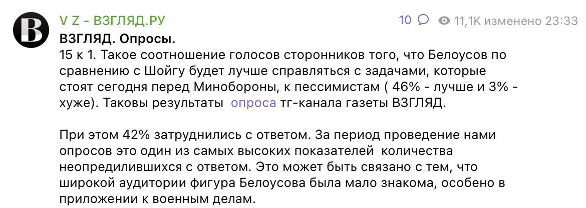 Неожиданная рокировка в правительстве России привлекла большое внимание как в России, так и на Западе. На пост нового министра обороны Путин предложил не военного, а экономиста - бывшего заместителя председателя правительства Андрея Белоусова. Решение стало полной неожиданностью для многих, так как Белоусов в должности первого вице-премьера отвечал за финансовую, кредитную и денежную политику государства.