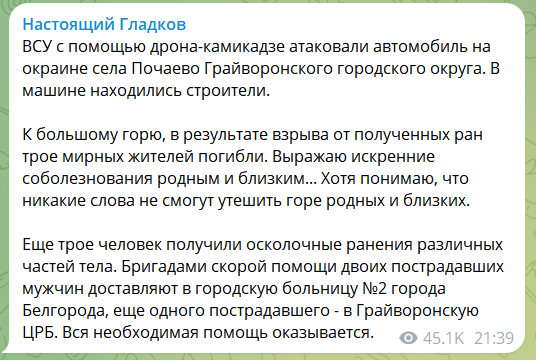 ВСУ в Белгородской области атаковали автомобиль с помощью дрона-камикадзе. В результате нападения погибли три мирных жителя, сообщил губернатор русского приграничного региона Вячеслав Гладков в своем Telegram-канале.