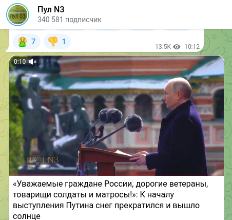 Отметим, что буквально перед тем, как президент взял слово, над Красной площадью, где проходит парад Победы, перестал идти снег и выглянул солнце.