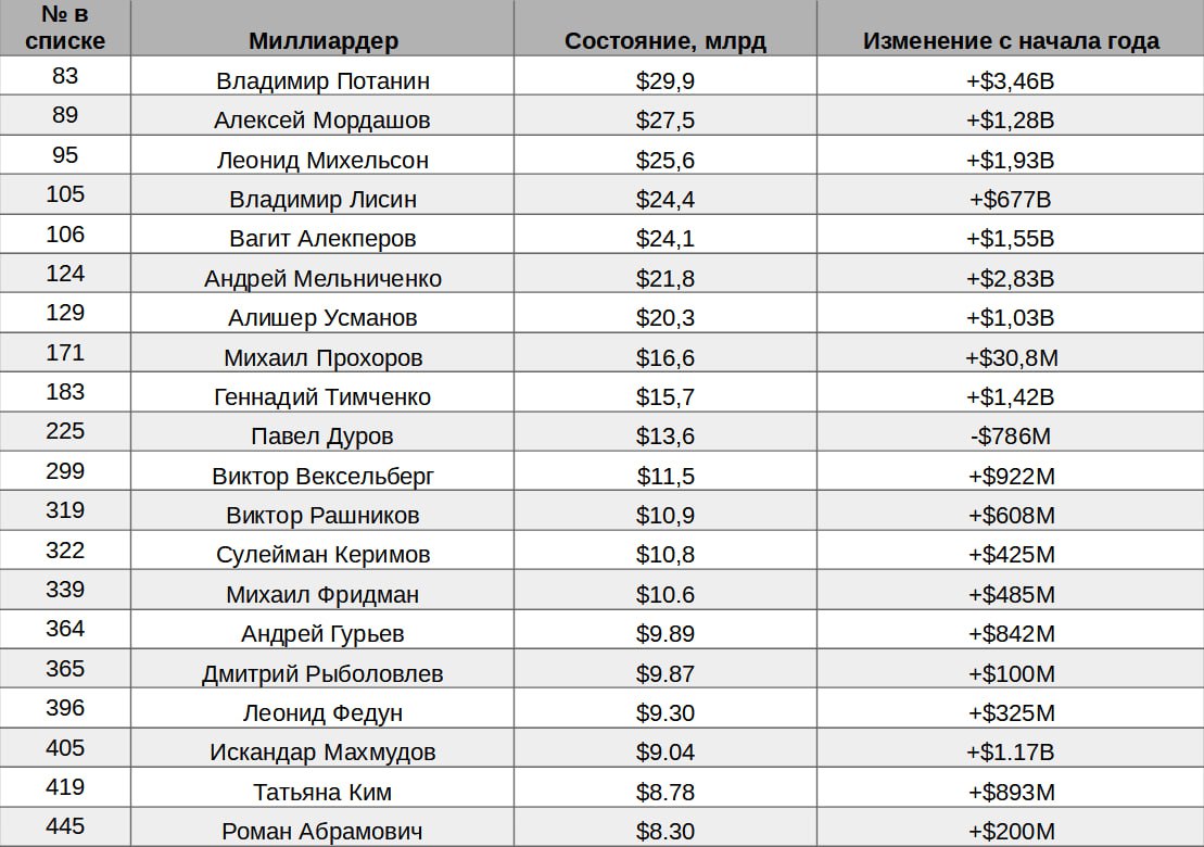 Эта тройка бизнесменов значится в российской части индекса-500 миллиардеров от Блумберг. И каждый показывал значительный прирост капитала в течение года. Ниже представлен скриншот таблицы, где, помимо Мордашова, Михельсона и Лисина, есть и другие игроки: