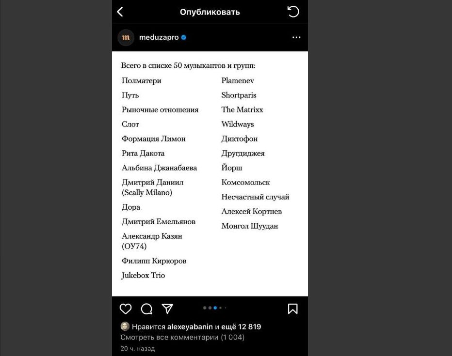 Первая часть нового чёрного списка. Скриншот: аккаунт издания "Медуза"* в социальной сети "Инстаграм"***