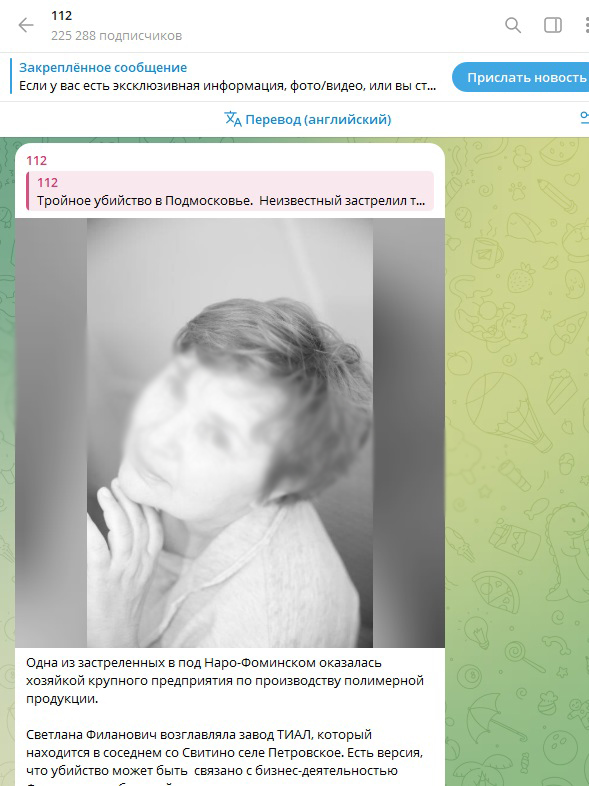Предполагается, что убийцы (или убийца) расправились с генеральным директором завода ТИАЛ Светланой Филанович. Специализируется этот завод, если верить открытым источникам, на производстве полимерной продукции.