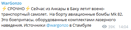 Сейчас из Анкары в Баку летит военно-транспортный самолёт. На борту авиационные бомбы Mk 82. Это боеприпасы, оборудованные комплектами лазерного наведения, - пояснил он.