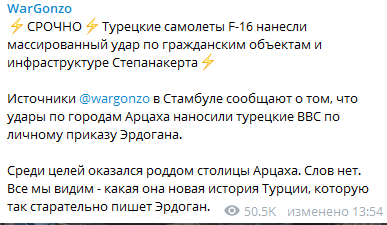 WarGonzo со ссылкой на источники сообщил, что авиация Турции ударила по Степанакерту. Источники в Стамбуле утверждают, что авианалёт силами F-16 совершён по личному приказу президента Турции Эрдогана.