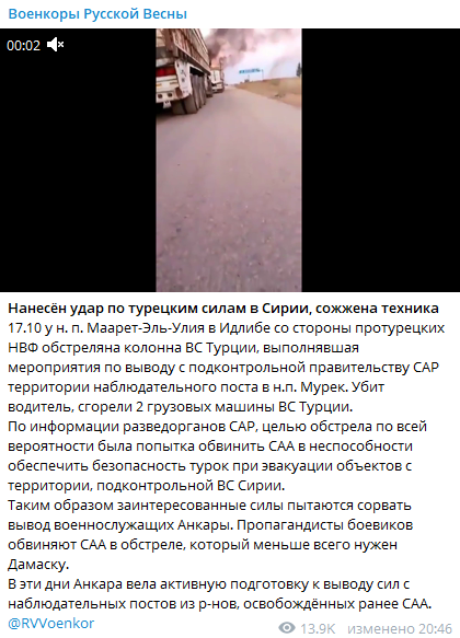 Террористы нанесли удар по турецкой автоколонне в районе населённого пункта Маарет-Эль-Улия в Идлибе, когда турки выводили свои силы с подконтрольной официальному Дамаску территории. В результате атаки два военных грузовика были уничтожены, один из водителей - убит.