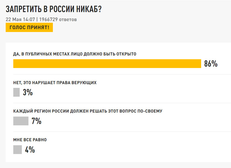 Ранее Царьград опубликовал опрос "Нужен ли запрет на ношение никаба в России?" Проголосовало почти 2 млн человек, 86% участников выбрали вариант "Да, в публичных местах лицо должно быть открыто".