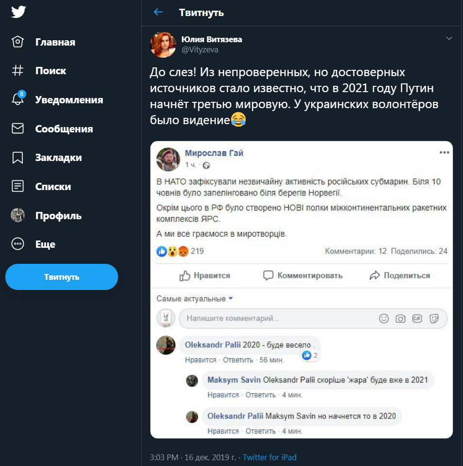 Юлия Витязева прокомментировала этот пост: "До слёз! Из непроверенных, но достоверных источников стало известно, что в 2021 году Путин начнёт третью мировую. У украинских волонтёров было видение".