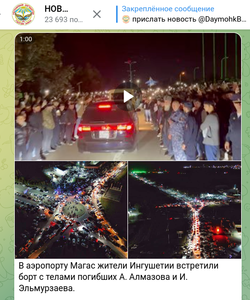 Telegram-канал "Новости Ингушетии" сообщил, что в аэропорту Магас борт с телами погибших встретили тысячи жителей Ингушетии. Машины с телами погибших отъехали от аэропорта в сопровождении автомобилей скорой помощи: