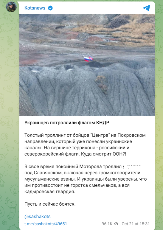 Паника в рядах ВСУ только усугубляется. Не успели там отойти от удара в виде "высадки" северокорейцев у Одессы, как последовал новый. Внезапно на одном из участков Донецкого фронта, а именно - на освобождённой территории в районе Цукурино появились сразу два флага. Один - наш. А вот второй… флаг КНДР. Разумеется, это был мощный подлив топлива в костёр слухов о том, что в ряды наших бойцов влилось секретное подразделение корейского спецназа.