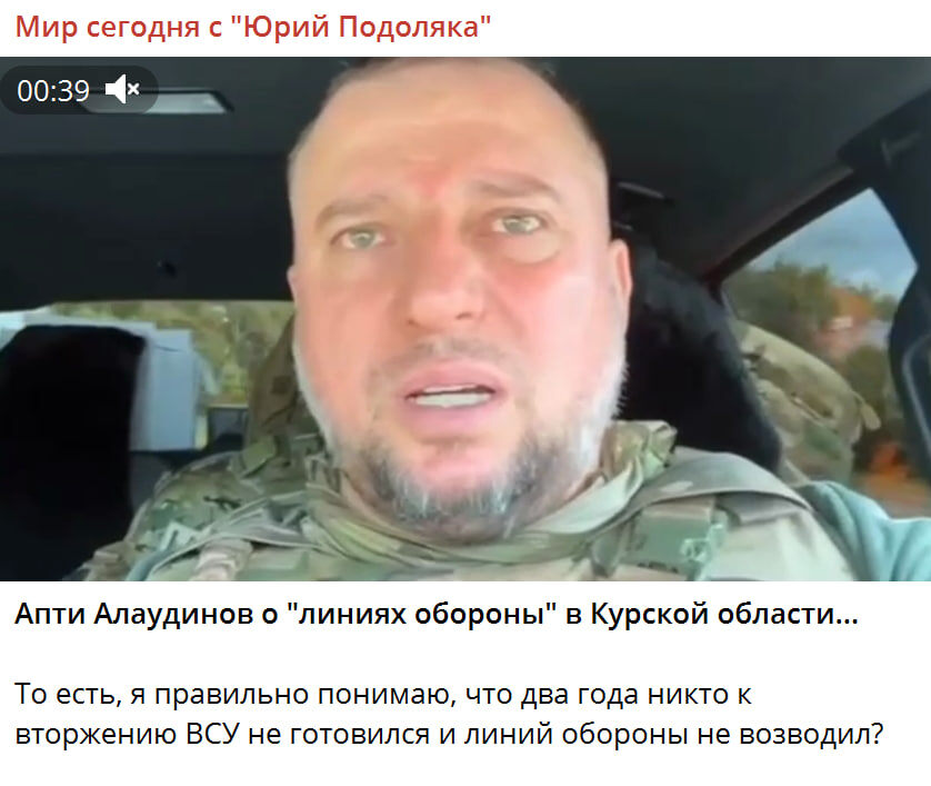 В Курске до сих пор складывается тяжёлая обстановка, докладывают бойцы и военкоры с фронта. Атакован Курск - сообщается, что враг "впервые" так ударил. Командир "Ахмата" генерал Алаудинов призвал молиться. Поступила информация о прорыве на "несколько десятков км". Началась паника - опровержение не помогло. Военкоры запросили у Белоусова "радикальные меры".