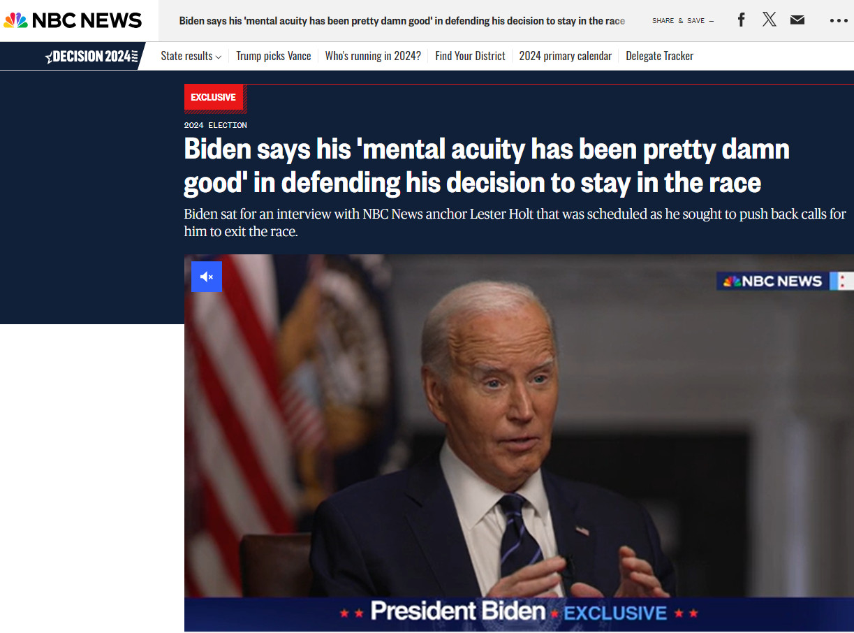 Байден дал интервью NBC News, в котором, защищая своё решение остаться в предвыборной гонке, заявил, что его "умственная острота была чертовски хороша". Как подсчитали специалисты, в 20-минутном ролике сделали 87 склеек. И это всё равно не спасло Джо.