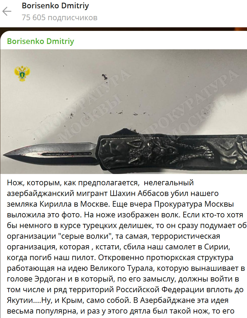 "Нож, которым, как предполагается, нелегальный азербайджанский мигрант Шахин Аббасов убил нашего земляка Кирилла в Москве. Ещё вчера прокуратура Москвы выложила это фото. На ноже изображён волк. Если кто-то хотя бы немного в курсе турецких делишек, то он сразу подумает об организации "серые волки" - та самая террористическая организация, которая, кстати, сбила наш самолёт в Сирии, когда погиб наш пилот", - поделился журналист в своём телеграм-канале.
